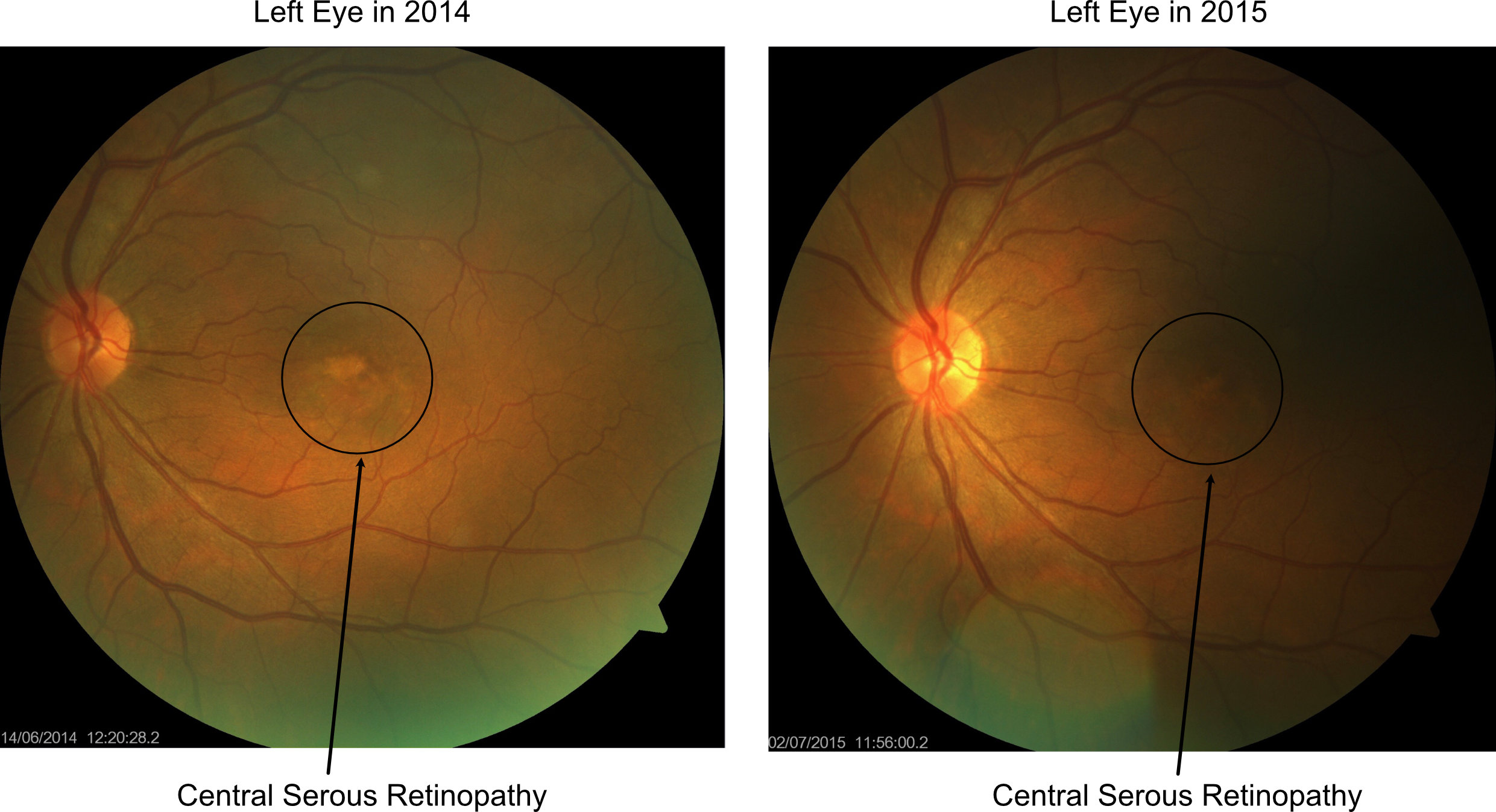 The images below shows the progress of his eye disease (Central Serous Retinopathy) from 2014 to 2015. According to the fundus photos taken, there was little improvement from 2014 to 2015. Fortunately, his left eye’s vision has improve.