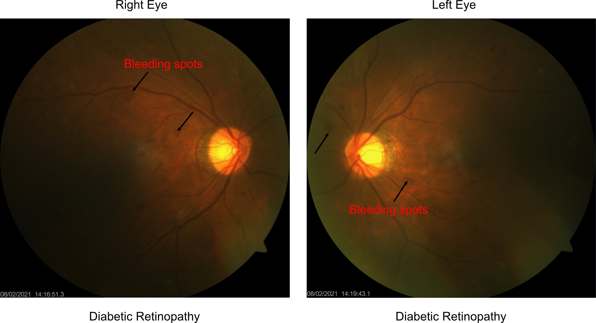 In one of our articles, we discussed whether can diabetes affect our eyes. It was also mentioned in that article that one of our patients have diabetes but have never visited an eye specialist to check his eyes. During his visit with us, we found that he have Diabetic Retinopathy and it was already affecting his vision. The images below shows the bleeding spots caused by Diabetic Retinopathy on the back part of his eyes. We referred him to see the eye specialist as soon as possible before any irreversible vision impairment occurs.